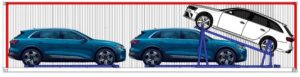 - Loading three cars inside the 40-foot container, so that two cars are stuffed in a horizontal position, and on top of one of them a third car is installed on an inclined barrier, such as installing an Audi A4 Allroad car + two Audi E-Tron cars, as follows: